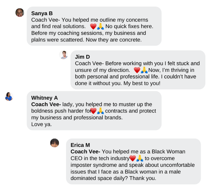 Hi, I’m Coach Vee, a seasoned life coach with over 25 years of experience in leadership and career development. Throughout my career, I’ve helped countless individuals for entrepreneurs to colleges to midlife career transition individuals –overcome obstacles and thrive in their professional